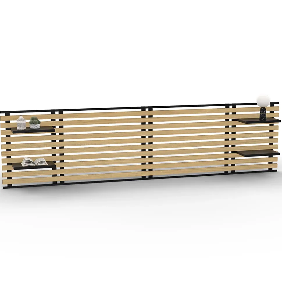 Apportez une touche industrielle et design dans votre chambre à coucher grâce à la tête de lit DETROIT, avec son cadre en métal noir et ses lattes effet bois.D’une hauteur de 62 cm, vous pourrez vous adosser confortablement avec vos oreillers pour regarder un film ou lire votre livre préféré. Pratique, elle s’adapte à tous les lits de 140 et 160 cm et ne prend pas de place grâce à ses accroches murales et son design fin.Composée de 4 tablettes de chevet noires modulables, vous pourrez les placer à la hauteur qui vous convient. Déposez vos affaires personnelles, nécessaires de nuit, réveil ou encore lampe de chevet, tout en les ayant à portée de main.Cette tête de lit habillera votre mur à la perfection et apportera une touche industrielle et design à votre chambre à coucher.Pour un effet encore plus cocooning dans votre chambre, choisissez d’entrelacer une guirlande lumineuse sur le haut de votre tête de lit et profitez ainsi d’une ambiance chaleureuse toute la soirée. Dimensions de la tête de lit lattes DETROIT 240 cmDimensions totales : Longueur 240 cm x largeur 23,5 cm x Hauteur 62 cmDimensions d’une étagère : L.32,5 x l.20,5 x H.1,8 cmMatériaux : Métal + PB + MDF Coloris : Bois et noirEspace entre chaque latte : 2 cmLongueur centrale entre les étagères : 160 cmKit de fixation inclusÀ monter soi-mêmeRetrouvez l’ensemble de nos têtes de lit sur notre boutique en ligne !