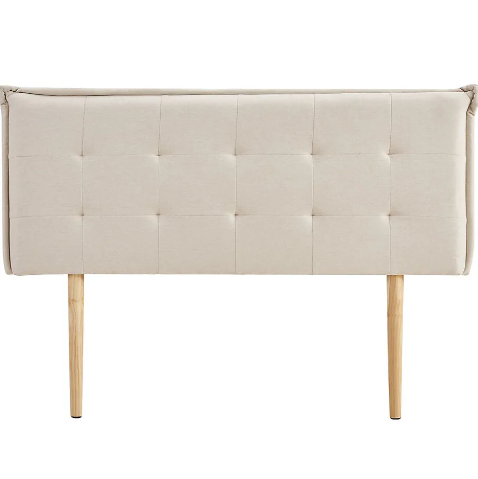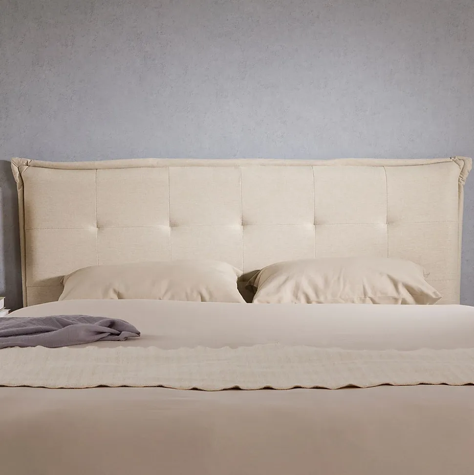 Tête de lit Timothé capitonnée Transformez votre chambre avec cette tête de lit moderne et pratique. Avec son rembourrage et son design décoratif capitonné, elle met l’accent à la fois sur le confort et l’élégance pour une ambiance chaleureuse. Conçue pour les lits jusqu’à 140 cm de largeur, elle se distingue par son tissu résistant au boulochage et ses pieds en bois naturel qui assurent une installation stable et sans effort. Description des matériaux : – Le revêtement de la tête de lit est en tissu 100% polyester, coloris écru. – Les pieds sont en bois d’hévéa. Caractéristiques du produit : – Hauteur des pieds : 42 cm – Tête de lit capitonnée pour un design travaillé et moderne – Convient pour les lits jusqu’à 140 cm – Conseils d’installation : posez la tête de lit directement sur le sol et coincez-la entre le mur et votre lit pour assurer sa stabilité Livraison et montage : – Contenu de la livraison : 1 tête de lit – Article livré en une seule pièce – Assemblage facile grâce à la notice fournie – Livraison par transporteur – Article livré sans décoration – Photo non contractuelle Résumé: – Hauteur tête de lit: 99 cm – Convient uniquement avec: Sommier fagot à lattes – Description du matériel: 100% Polyester – Dimensions monté: 99 x 142 x 7 cm (H x L x L) – Couchage: 140 x 190 cm, 140 x 200 cm, 140 x 220 cm – Couleur: Beige – Matériel: Tissu de recouvrement, Bois