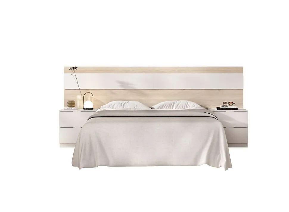 TÊTE DU LIT – Tête de lit, Tête de lit pour la chambre, Appui-tête, 248×34 h96 cm, Chêne clair et Blanc. STRUCTURE ET UTILISATION – La structure aux lignes modernes de cet ensemble est parfaite pour décorer tout type de chambre d’enfant ou d’adulte – À l’intérieur des deux tiroirs de la table de chevet, il est possible de placer vos objets et les choses nécessaires pour la nuit de manière discrète et bien rangé, tandis que sur la surface supérieure, vous pouvez placer vos livres et décorations préférés pour donner au produit un style personnalisé – Ensemble avec tête de lit adapté à tout type de chambre. QUALITÉ ET DESIGN – Meuble au design moderne et élégant, parfait pour meubler un environnement contemporain et lumineux – Idéal pour ceux qui recherchent des solutions fonctionnelles et peu encombrantes, ce produit est parfait pour les maisons et les appartements de toutes tailles – Garantie de deux ans à compter de la date d’achat. CARACTÉRISTIQUES TECHNIQUES – Accessoire d’ameublement polyvalent, conçu pour une intégration facile avec d’autres meubles – Emballage résistant, conçu pour le commerce électronique – Matériau: Panneau mélaminé 16mm – Informations supplémentaires: Fabriqué entièrement en panneaux de particules mélaminés, un matériau résistant aux chocs et aux rayures, durable et imperméable – Chants avec finition mélamine – Classement selon la teneur ou le rejet de formaldéhyde de TYPE E1 – Le montage est simple et rapide : grâce aux outils de montage fournis dans un kit avec le produit et le livret d’instructions vous pouvez assembler votre produit en quelques minutes – Deux tables de chevet avec quatre tiroirs inclus – Convient pour lit 190×135-140 cm – Poids maximum supporté par tiroir : 4 Kg – Chêne effet ondulé. DIMENSIONS EN CM – Tête du lit : Longueur: 248 Largeur: 34,2 Hauteur: 96
