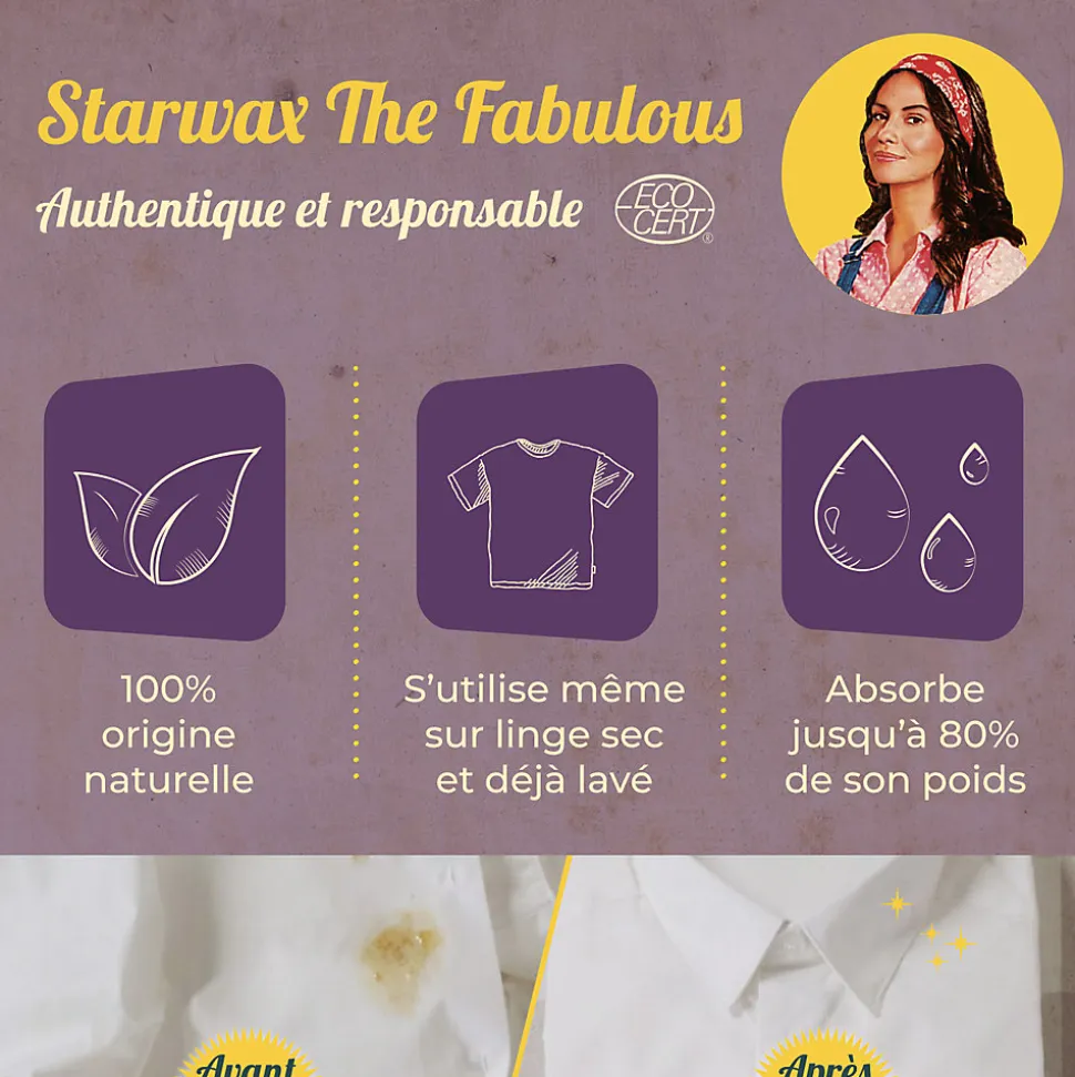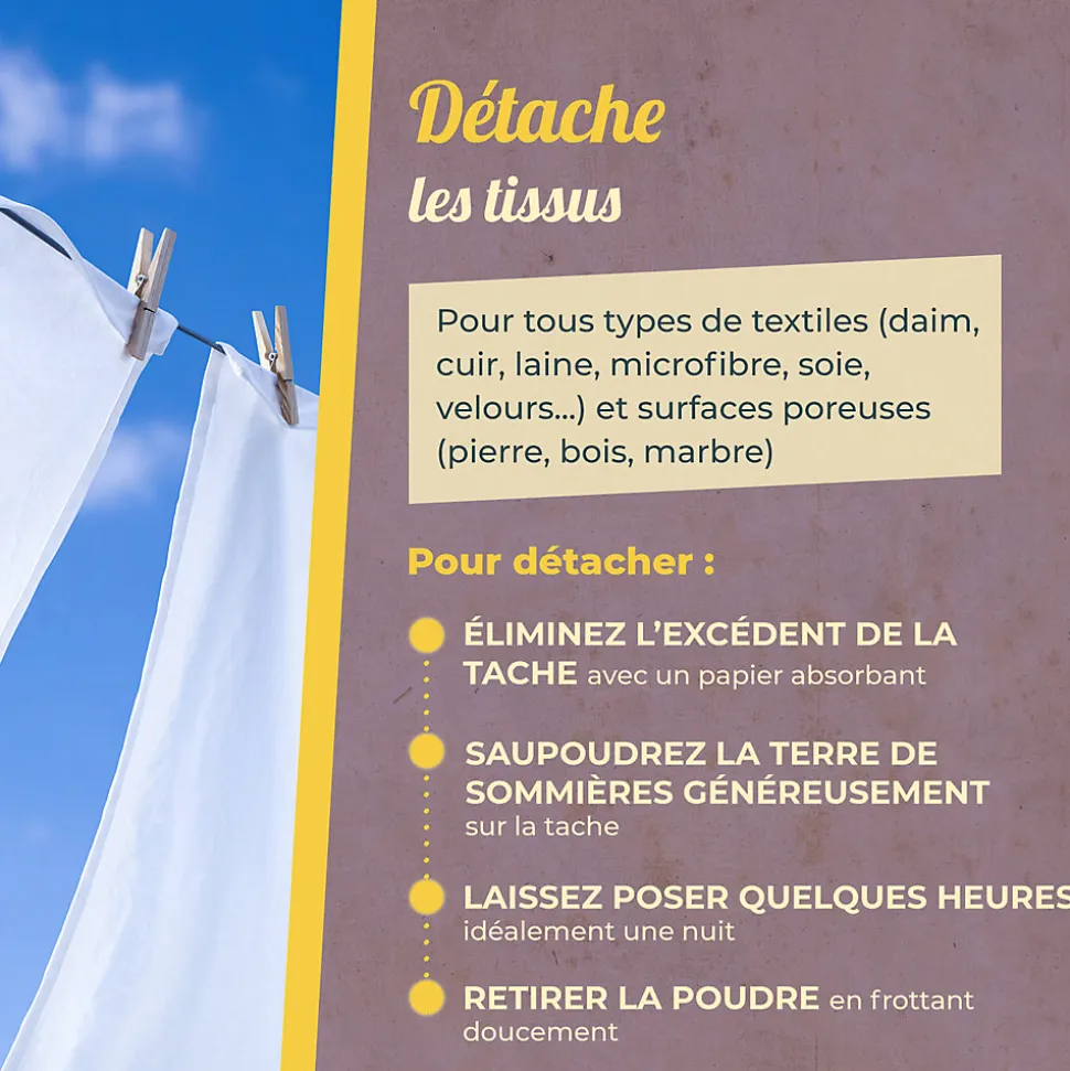 - Absorbe tâche, détache à sec les textiles délicats, neutralise les mauvaises odeurs