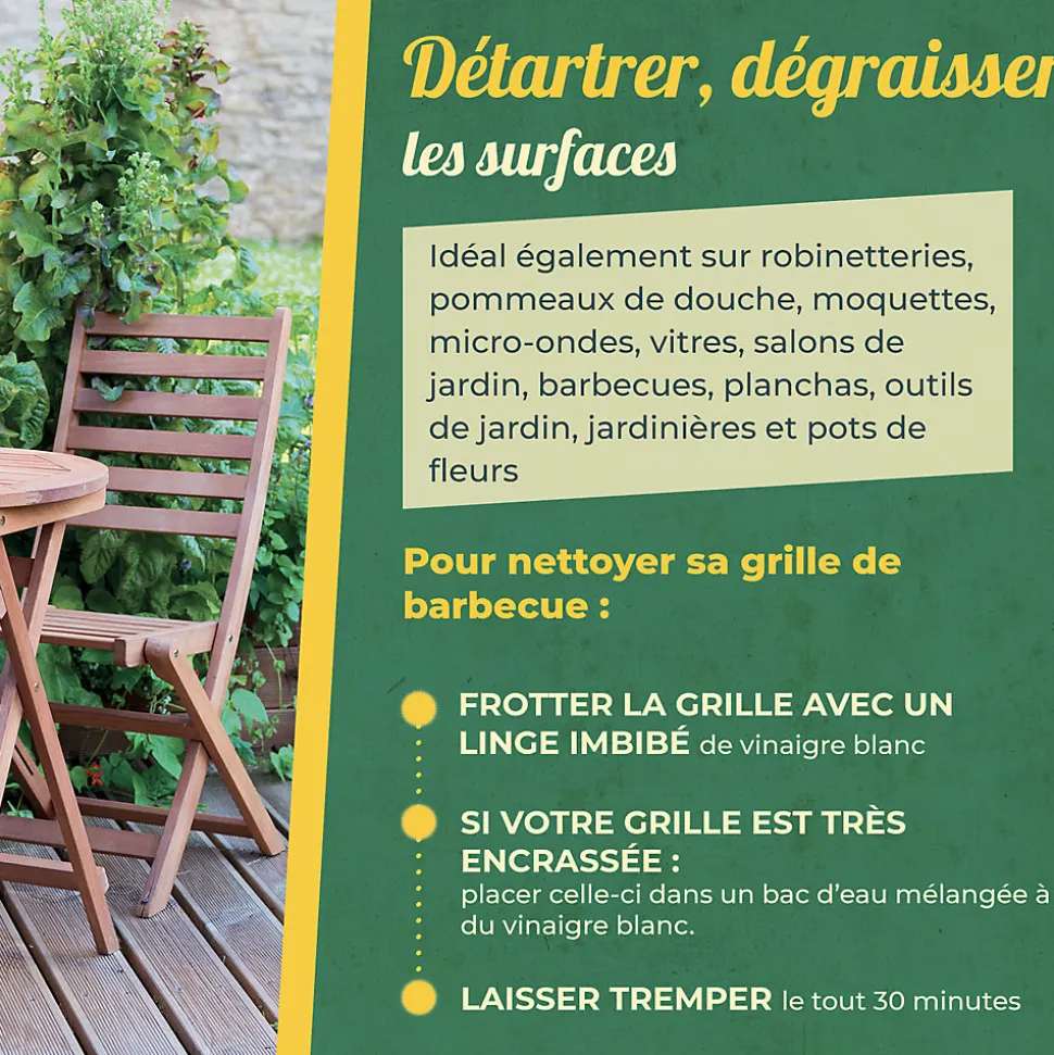 Idéal pour l’entretien de sa maison et son jardin. Nettoie vitres, salons de jardin, barbecues, planchas… Entretien les canalisations. Il ne contient aucun tensio-actif, colorant ou OGM.