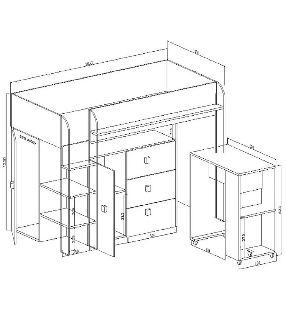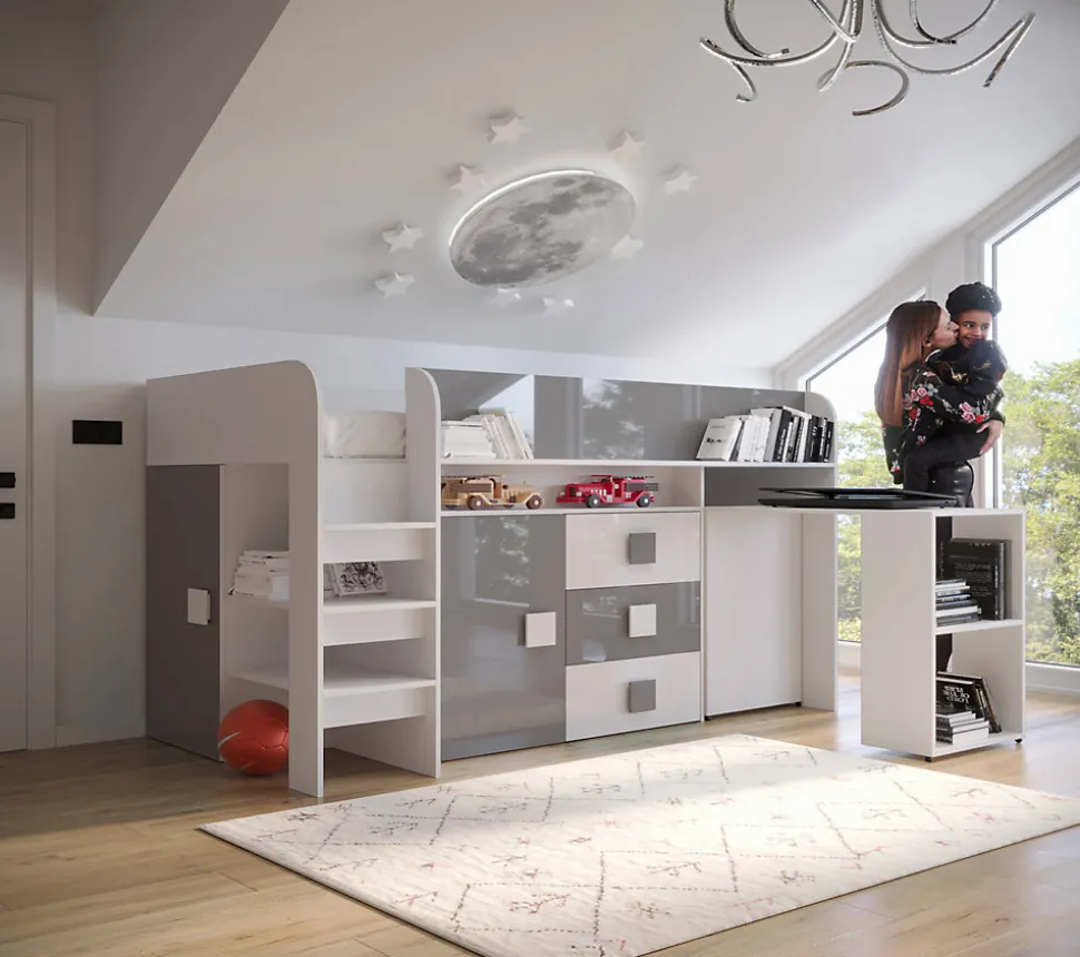Meuble Multifonctionnel:Nous vous proposons une solution révolutionnaire – le lit superposé avec bureau, escalier, armoire, étagère et tiroirs. Ce meuble moderne vous permettez d’avoir tous les objets nécessaires à portée de la main. Vous pouvez choisir la côté de lit pendant le montage. Lit Superposé pour Chambre Ado:Le lit superposé est un meuble nécessaire dans une chambre d’enfant ou d’adolescent. Cette option est très confortable, parce que vous pouvez optimiser l’espace de la chambre et gagner de la place, ce qui est excellent pour les petits espaces. Spécifications Techniques:Dimensions : 203.3 x 106.6 x 125 cm.Espace de couchage : 90 x 200 cm.Armoire avec barre : largeur – 46.7 / profondeur – 35cm,armoire avec étagère : largeur – 47.5 / profondeur – 38cm,tiroirs : largeur – 56,9 / profondeur – 35cm. Construction Solide:Le lit superposé est fabriqué en plateau stratifiée d’épaisseur 16 mm, chants finis avec un placage en PVC durable et résistant à l’usage quotidien, dos du meuble en panneau HDF, les tiroirs se déplacent sur des glissières à rouleaux, poignées en MDF. Livraison et Montage:Attention ! Notre entreprise de transport n’offert pas la possibilité de monter par l’escalier sur l’appartement et n’offert pas le service de montage. Les meubles sont livrés dans les paquets avec l’instruction de montage soi-même. La livraison est sur la palette. Information téléphonique sur la date de livraison. Veuillez demander un numéro de contact actualisé.