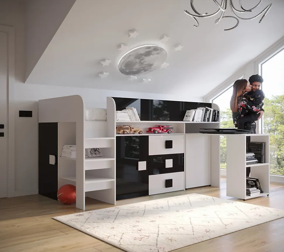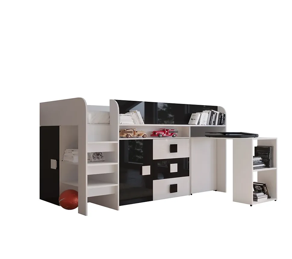 Meuble Multifonctionnel:Nous vous proposons une solution révolutionnaire – le lit superposé avec bureau, escalier, armoire, étagère et tiroirs. Ce meuble moderne vous permettez d’avoir tous les objets nécessaires à portée de la main. Vous pouvez choisir la côté de lit pendant le montage. Lit Superposé pour Chambre Ado:Le lit superposé est un meuble nécessaire dans une chambre d’enfant ou d’adolescent. Cette option est très confortable, parce que vous pouvez optimiser l’espace de la chambre et gagner de la place, ce qui est excellent pour les petits espaces. Spécifications Techniques:Dimensions : 203.3 x 106.6 x 125 cm.Espace de couchage : 90 x 200 cm.Armoire avec barre : largeur – 46.7 / profondeur – 35cm,armoire avec étagère : largeur – 47.5 / profondeur – 38cm,tiroirs : largeur – 56,9 / profondeur – 35cm. Construction Solide:Le lit superposé est fabriqué en plateau stratifiée d’épaisseur 16 mm, chants finis avec un placage en PVC durable et résistant à l’usage quotidien, dos du meuble en panneau HDF, les tiroirs se déplacent sur des glissières à rouleaux, poignées en MDF. Livraison et Montage:Attention ! Notre entreprise de transport n’offert pas la possibilité de monter par l’escalier sur l’appartement et n’offert pas le service de montage. Les meubles sont livrés dans les paquets avec l’instruction de montage soi-même. La livraison est sur la palette. Information téléphonique sur la date de livraison. Veuillez demander un numéro de contact actualisé.