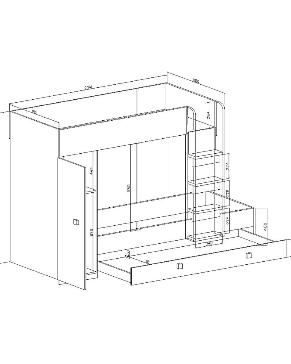 Meuble Multifonctionnel:Nous vous proposons une solution révolutionnaire – le lit superposé avec 3 surfaces de couchage, escalier et l’armoire, dans se trouve une étagère et un tringle. Ce meuble moderne vous permettez d’avoir tous les objets nécessaires à portée de la main. Vous pouvez choisir la côté de lit pendant le montage. Lit Superposé pour Chambre Ado:Le lit superposé est un meuble nécessaire dans une chambre d’enfant ou d’adolescent. Cette option est très confortable, parce que vous pouvez optimiser l’espace de la chambre et gagner de la place, ce qui est excellent pour les petits espaces. Spécifications Techniques:Dimensions : 254 x 165 x 94 cm (largeur x hauteur x profondeur).Trois surfaces de couchage : 90 x 200 cm et 2 x 85 x 200 cm. Construction Solide:Le lit superposé est fabriqué en plateau stratifiée d’épaisseur 16 mm, chants finis avec un placage en PVC durable et résistant à l’usage quotidien, dos du meuble en panneau HDF, les tiroirs se déplacent sur des glissières à rouleaux, poignées en MDF. Livraison et Montage:Attention ! Notre entreprise de transport n’offert pas la possibilité de monter par l’escalier sur l’appartement et n’offert pas le service de montage. Les meubles sont livrés dans les paquets avec l’instruction de montage soi-même. La livraison est sur la palette. Information téléphonique sur la date de livraison. Veuillez demander un numéro de contact actualisé.