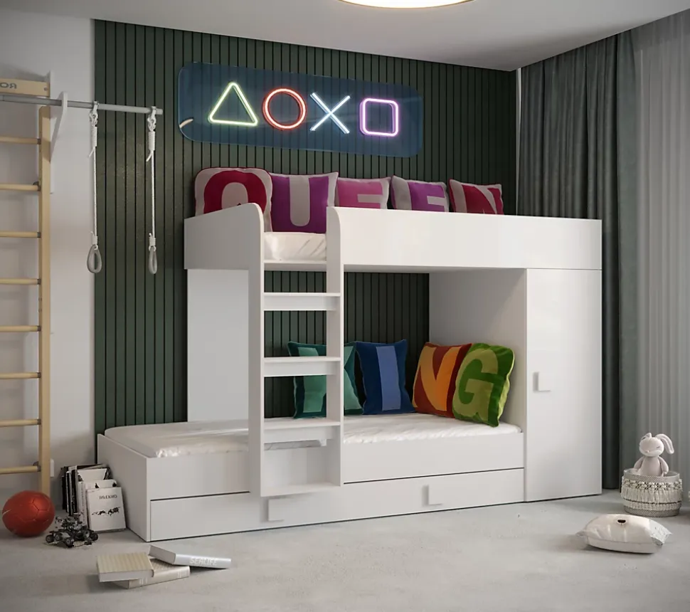 Meuble Multifonctionnel:Nous vous proposons une solution révolutionnaire – le lit superposé avec 3 surfaces de couchage, escalier et l’armoire, dans se trouve une étagère et un tringle. Ce meuble moderne vous permettez d’avoir tous les objets nécessaires à portée de la main. Vous pouvez choisir la côté de lit pendant le montage. Lit Superposé pour Chambre Ado:Le lit superposé est un meuble nécessaire dans une chambre d’enfant ou d’adolescent. Cette option est très confortable, parce que vous pouvez optimiser l’espace de la chambre et gagner de la place, ce qui est excellent pour les petits espaces. Spécifications Techniques:Dimensions : 254 x 165 x 94 cm (largeur x hauteur x profondeur).Trois surfaces de couchage : 90 x 200 cm et 2 x 85 x 200 cm. Construction Solide:Le lit superposé est fabriqué en plateau stratifiée d’épaisseur 16 mm, chants finis avec un placage en PVC durable et résistant à l’usage quotidien, dos du meuble en panneau HDF, les tiroirs se déplacent sur des glissières à rouleaux, poignées en MDF. Livraison et Montage:Attention ! Notre entreprise de transport n’offert pas la possibilité de monter par l’escalier sur l’appartement et n’offert pas le service de montage. Les meubles sont livrés dans les paquets avec l’instruction de montage soi-même. La livraison est sur la palette. Information téléphonique sur la date de livraison. Veuillez demander un numéro de contact actualisé.
