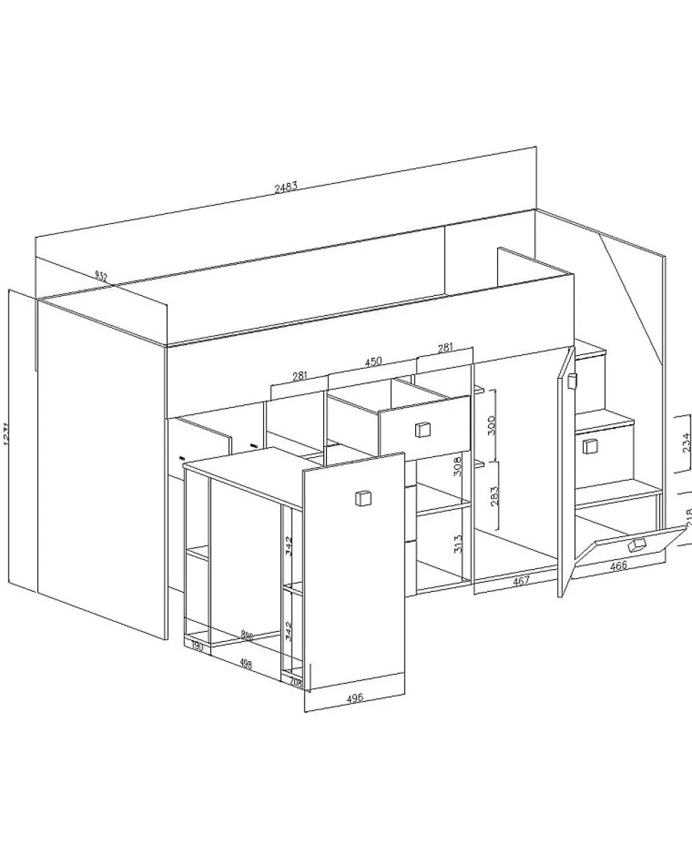 Meuble Multifonctionnel:Nous vous proposons une solution révolutionnaire – le lit superposé avec bureau coulissant, marchepieds, armoire avec barre coulissante, 4 tiroirs, 6 étagères ouvertes et 3 armoires avec étagères. Ce meuble moderne vous permettez d’avoir tous les objets nécessaires à portée de la main. Le montage de lit à gauche. Lit Superposé pour Chambre Ado:Le lit superposé est un meuble nécessaire dans une chambre d’enfant ou d’adolescent. Cette option est très confortable, parce que vous pouvez optimiser l’espace de la chambre et gagner de la place, ce qui est excellent pour les petits espaces. Spécifications Techniques:Dimensions : 248,5 x 123 x 93 cm (largeur x hauteur x profondeur).Surface de couchage : 90 x 200 cm.Bureau 88 x 76 x 45,5 cm (largeur x hauteur x profondeur ) et espace pour les jambes 50 cm Construction Solide:Le lit superposé est fabriqué en plateau stratifiée d’épaisseur 16 mm, chants finis avec un placage en PVC durable et résistant à l’usage quotidien, dos du meuble en panneau HDF, les tiroirs se déplacent sur des glissières à rouleaux, poignées en MDF. Livraison et Montage:Attention ! Notre entreprise de transport n’offert pas la possibilité de monter par l’escalier sur l’appartement et n’offert pas le service de montage. Les meubles sont livrés dans les paquets avec l’instruction de montage soi-même. La livraison est sur la palette. Information téléphonique sur la date de livraison. Veuillez demander un numéro de contact actualisé.