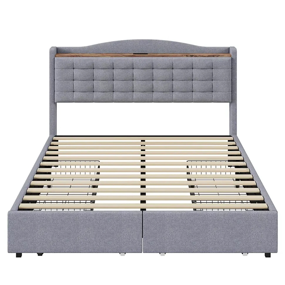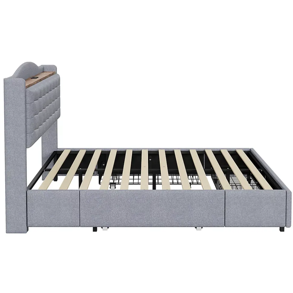 Lit king lin gris clair rembourré 4 tiroirs avec 2 prises USB (160*200 cm) Ce lit rembourré pour un espace de vie moderne est équipé d’une tête de lit avec port de chargement USB et d’un plateau pratique, afin que vous ayez toujours vos appareils à portée de main pendant que vous vous reposez.Ce lit double est enveloppé dans un tissu en lin agréable pour la peau dans une élégante teinte grise, ajoutant une touche raffinée à votre chambre. Quatre tiroirs surdimensionnés sous le lit offrent beaucoup d’espace pour la literie, les vêtements et d’autres objets essentiels, et contribuent à l’organisation de votre pièce.Améliorez votre expérience de sommeil avec nos lits rembourrés élégants et pratiques et profitez du confort et de la commodité d’un design chic et moderne. Polyvalent : Ce lit double rembourré est doté d’un port de charge USB intégré et d’un plateau au niveau de la tête du lit, vous permettant d’emporter facilement vos appareils et autres affaires.Tissu en lin : Ce lit doux est recouvert d’un élégant tissu en lin gris, qui est respectueux de la peau et respirant, résistant à l’usure et déperlant, ajoutant une touche de sophistication à votre chambre à coucher.Espace de rangement abondant : Ce lit plat est équipé de quatre grands tiroirs, offrant beaucoup d’espace pour la literie et les vêtements.Caractéristiques :Matériel : Tissu lin + métal + contreplaqué + MDF Dimensions du produit :Largeur : 200 cmProfondeur : 166 cmHauteur : 110 cmMatelas assorti (sans matelas) 160X200cm(Épaisseur du matelas 23-27cm)Dimensions du colis 2 colis :105.5 * 54 * 14 cm166.5 * 44 * 15 cmPoids total/brut: 47/50 kgGarantie :2 ans (voir politique de garantie)