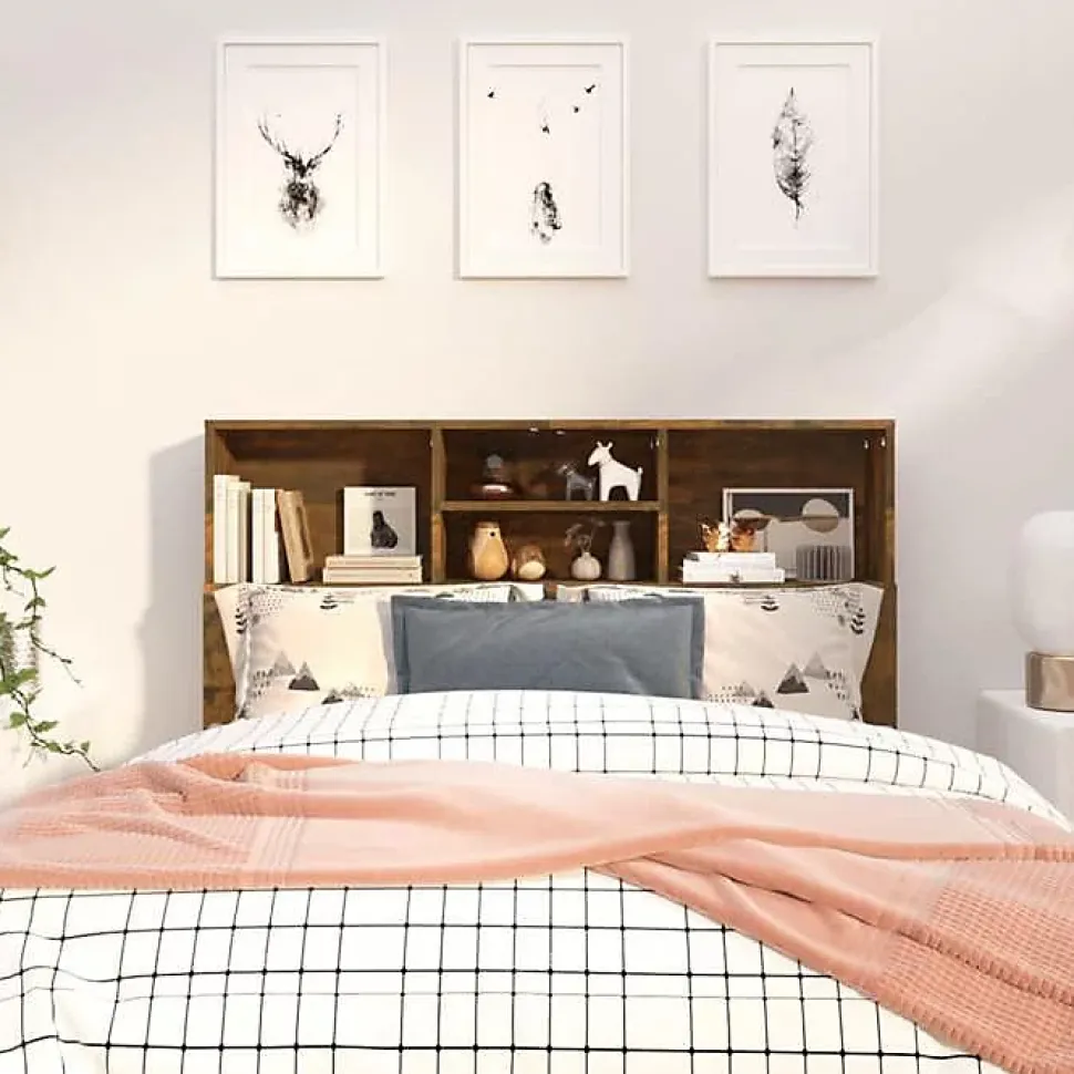 Armoire de tête de lit en chêne fumé massif, dimensions 120 x 19 x 103,5 cm, avec 4 compartiments. Design élégant, finition soignée, idéale pour chambre à coucher contemporaine. Livraison offerte, assemblage requis.