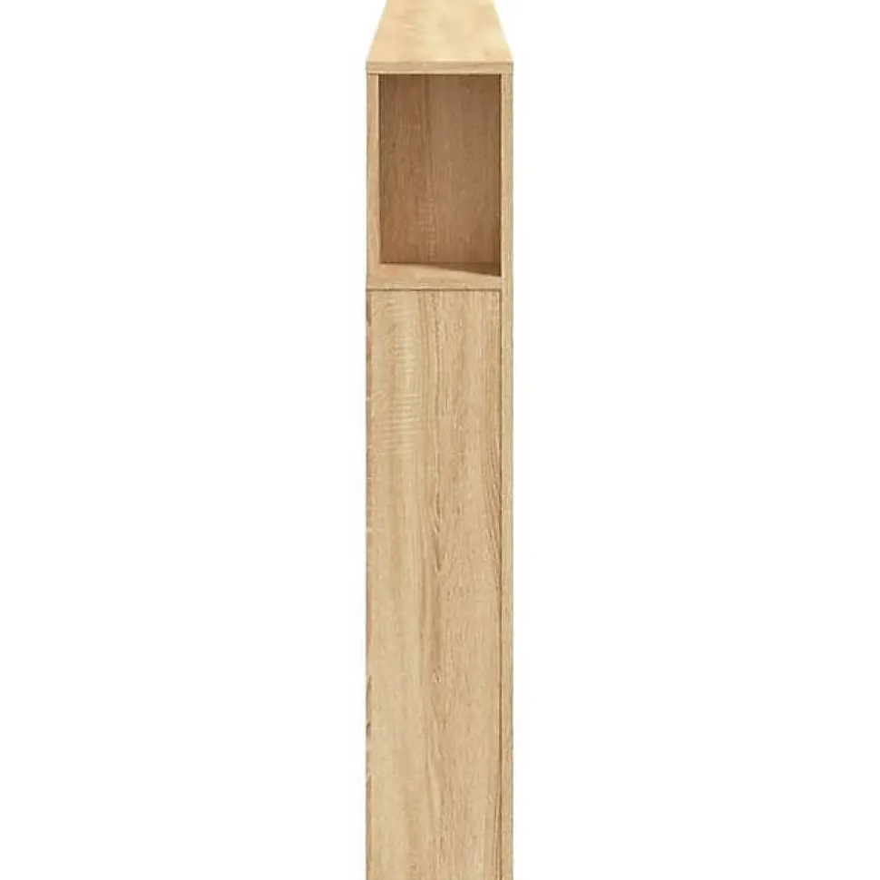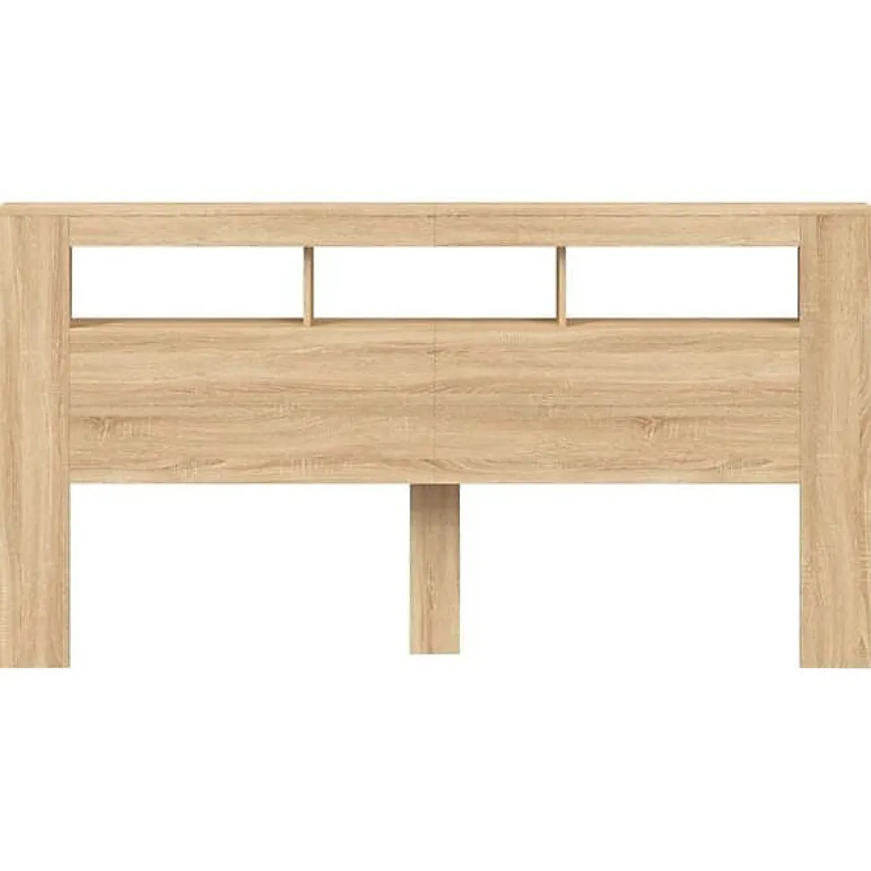 Tête de lit chêne sonoma avec LED RVB réglable, fabriquée en bois d’ingénierie durable. Dimensions 200 x 18,5 x 103,5 cm. Rangement intégré, connecteur USB 5V (alimentation non incluse). Offre un soutien dorsal confortable. Assemblage requis.