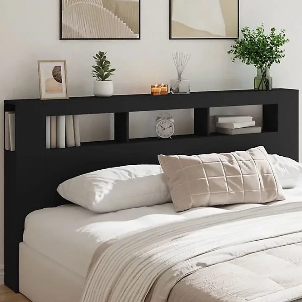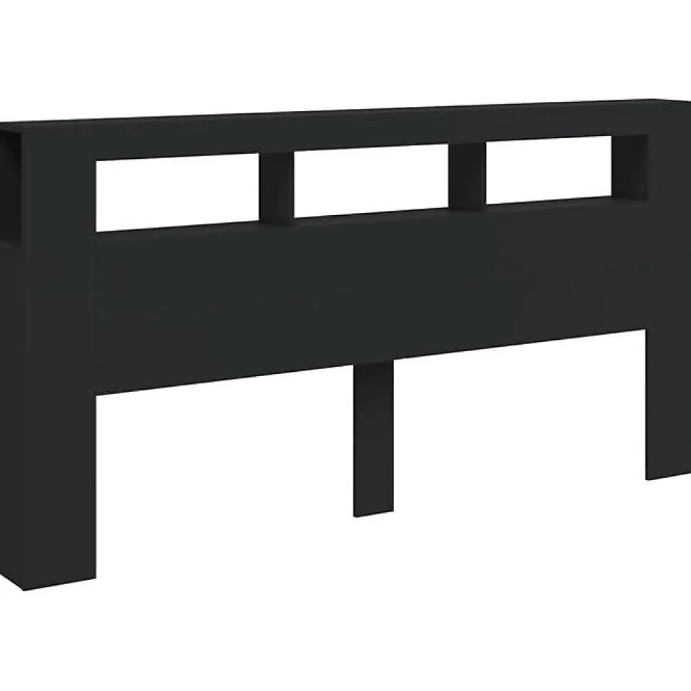 Tête de lit design noire en bois d’ingénierie avec éclairage LED RVB réglable, plateau supérieur et espaces de rangement ouverts. Dimensions 200 x 18,5 x 103,5 cm. Alimentation LED par USB 5V (non incluse). Produit à monter.