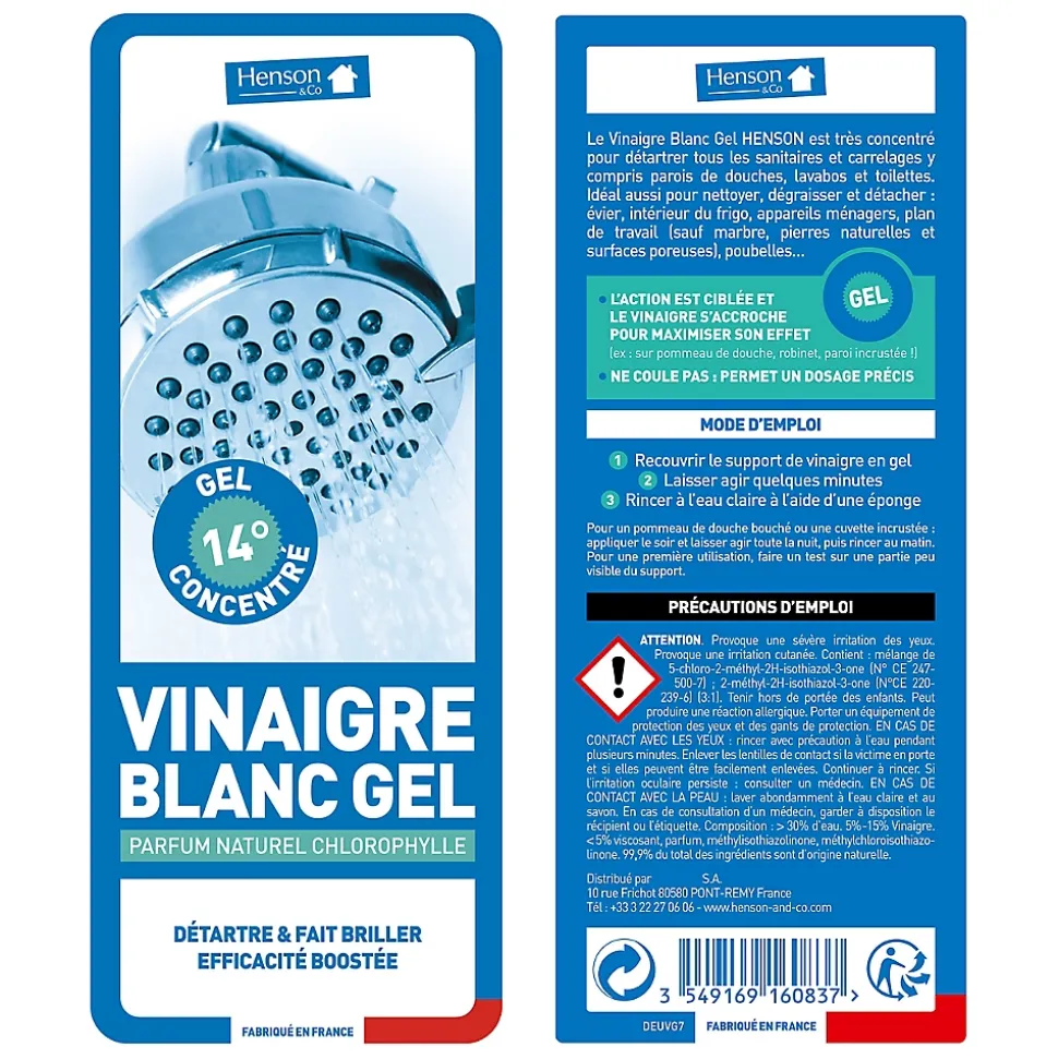 Vinaigre blanc en gel pour détartrer en profondeur, nettoyer, dégraisser et détacher les supports, objets, pièces du quotidien. Recouvrir le support de vinaigre en gel. Laisser agir quelques minutes. Rincer à l’eau claire à l’aide d’une éponge. Pommeau de douche bouché, cuvette incrustée : appliquer le soir et laisser agir toute la nuit. Rincer au matin.