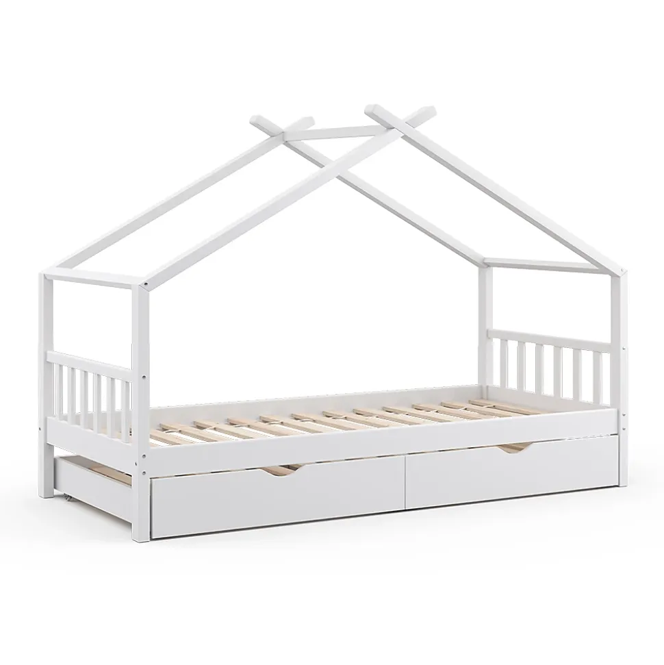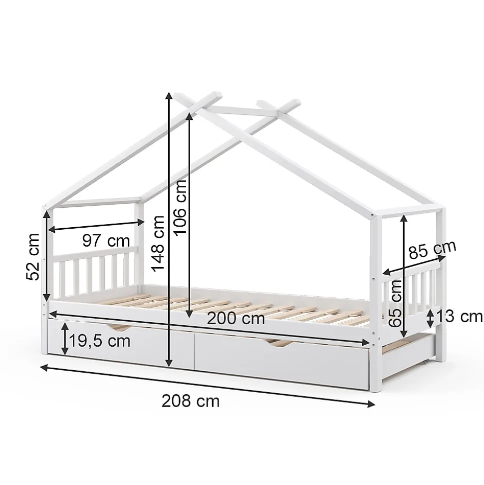 Lit pour chambre d’enfant « Design » : adapté à la maison, agréable à regarder. Ajoutez une touche de style et de confort à la chambre de votre enfant avec notre lit design pour enfant.Le lit et bois offre un lieu de jeu et de rêverie pour les enfants, stimulant leur créativité. Il est de haute qualité et constitue un élément fort de la chambre.DIMENSIONS : Le Lit enfant convient pour un matelas de90x200 cm et a une hauteur de 148 cm. Toutes les tailles détaillées sont indiquées sur les photos.MATÉRIAU: Le lit enfant avec toit est composé de bois de pin naturel.CONTENU DE LA LIVRAISON: Lit de maison, Instructions de montage, Matériel de montage